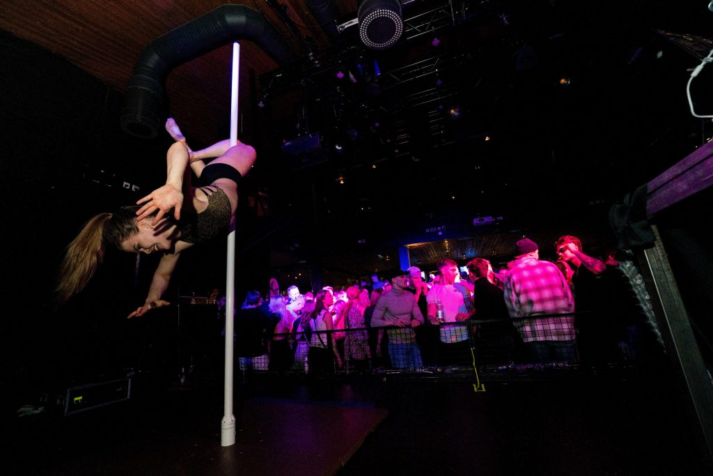 Ilma-akrobatiaa, tanssia ja tankotanssia kutsuvierastilaisuuden lomassa.